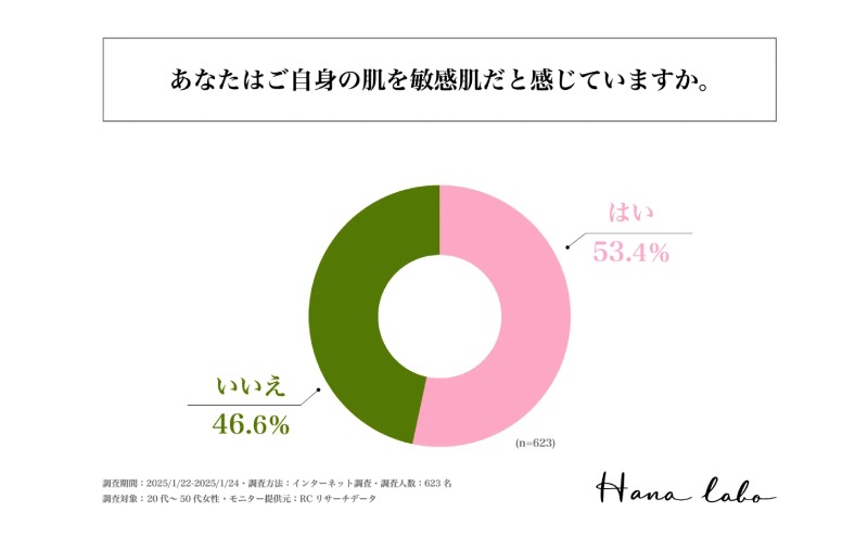 HANA LABO(ハナラボ)が20代から50代女性632人にアンケートをとった所、53.4%の人が敏感肌を感じています。敏感肌と感じている人が意外にも多いですね。