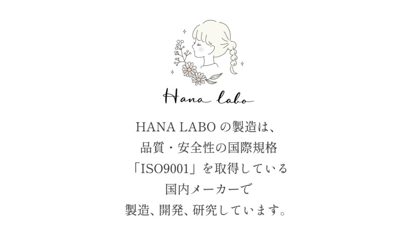 HANA LABO(ハナラボ)は国内製造かつ、『ISO9001』と言って品質マネジメントシステムに関する国際規格を取得しており「製品の性能」「安全性」「使いやすさ」など第三者機関からの厳しいチェックを通過した商品を販売しております。